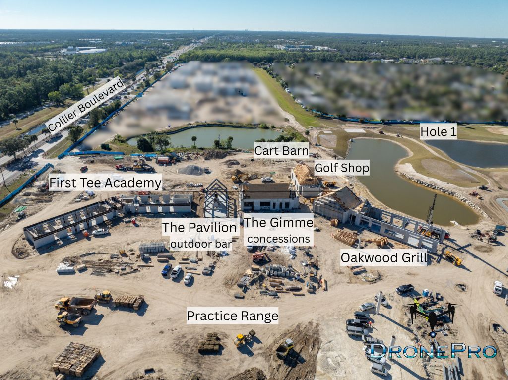 From left to right are the First Tee Academy, The Pavilion outdoor bar, The Gimme concessions area, the Cart Barn, the Golf Shop, and Oakwood Grill overlooking the water, with the practice range located in the foreground.
