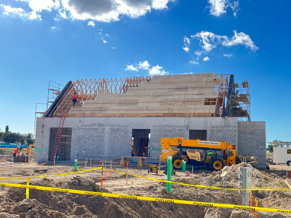 Additional photos below highlight ongoing construction progress, including steel framing and exterior sheathing installation at Oakwood Grill, The Pavilion, and The Gimme.
